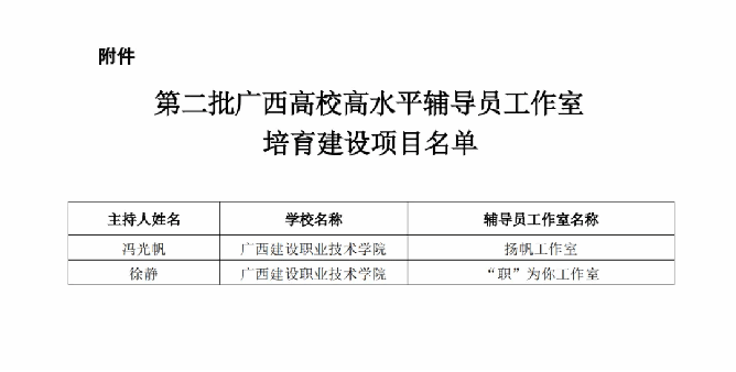 近日,自治区教育厅公布第二批广西高校高水平辅导员工作室培育建设项目名单,伟德国际官网设备与环境学院辅导员徐静主持的“职”为你工作室和土木工程学院辅导员冯光帆主持的扬帆工作室双双入选。