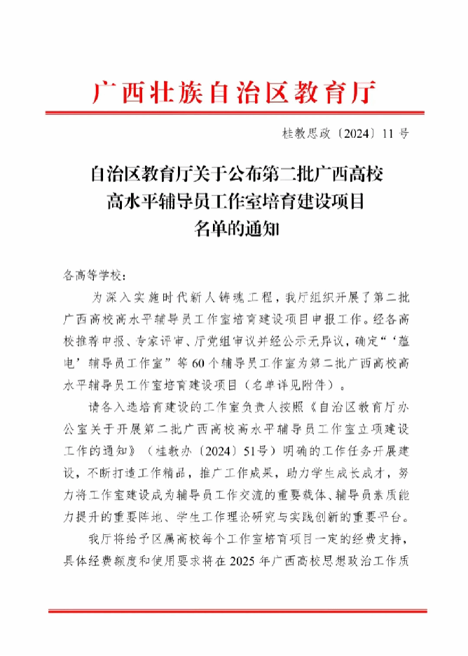 学校将以本次广西高校高水平辅导员工作室培育建设项目立项为契机,深入学习贯彻党的二十大和二十届历次全会精神,切实推动辅导员队伍职业化、专业化、专家化建设,激励全体辅导员担当为党育人、为国育才使命,为全面提升学校思想政治工作水平而团结奋斗。