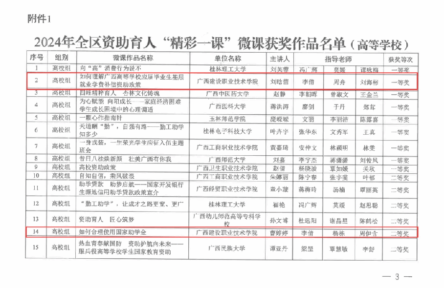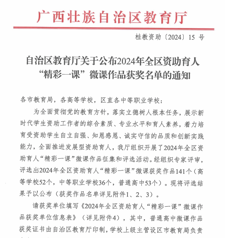 近日,自治区教育厅公布2024年全区资助育人“精彩一课”微课作品获奖名单,伟德国际官网刘晗蕾老师讲授的《如何理解广西高等学校应届毕业生基层就业学费补偿资助政策》荣获一等奖!曹婷婷老师讲授的《如何合理使用国家助学金》荣获二等奖!