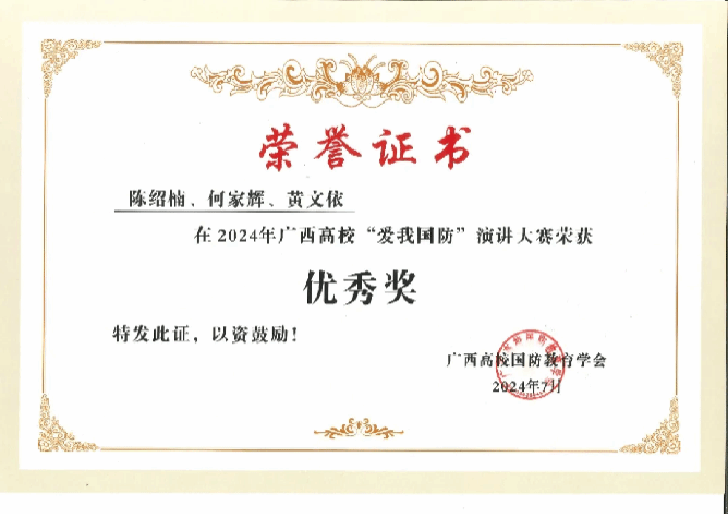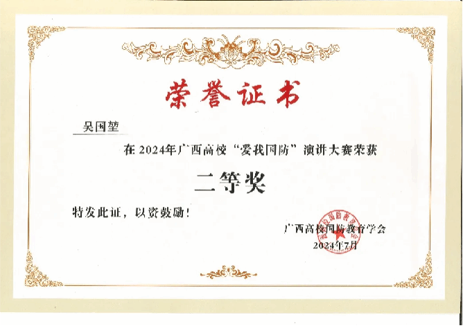 近日,由广西壮族自治区教育厅主办,广西高校国防教育学会承办的2024年广西高校“爱我国防” 演讲大赛落下帷幕,伟德国际官网选送的作品《39载守边路,铸就不朽“忠诚界碑”》荣获教师组二等奖,《打好国防舆论战 传播中国最强音》荣获学生组优秀奖。