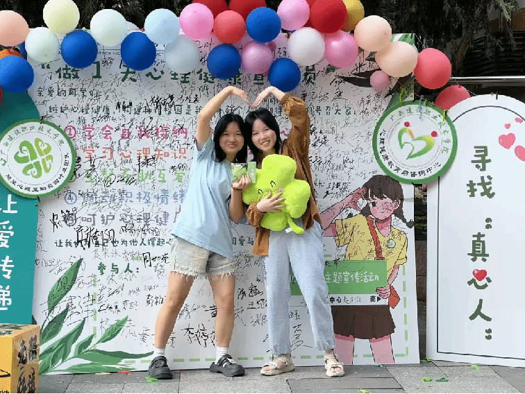 “寻找‘真心人’”活动,同学们秉承“自助成长、助人快乐、互助温暖”的朋辈互助理念,从容自信、用“心”交往,邀请校园中名字带“心”字的同学来到活动现场,共同参加心理宣传,传递友爱互助的校园正能量。