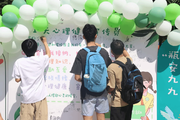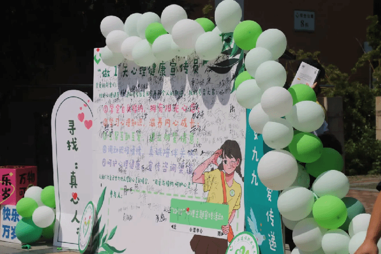“做1天心理健康宣传员”活动,同学们和心理互助员在主题“倡议书”展板上签名,共同学习分享心理知识宣传册,用互动打卡、拍照晒图等方式发布QQ空间和朋友圈,向广大同学普及心理健康和精神卫生相关知识。