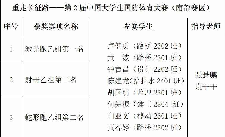 10月24日至27日,第2届中国大学生国防体育大赛(南部赛区)在北海市现代中等职业技术学校圆满落幕。这次大赛由中国学生体育联合会主办、中国学生体育联合会大学国防体育分会执行、北海市现代中等职业技术学校承办,分为南北两个赛区,伟德国际官网代表队与来自中国南部15个省、市、自治区及港澳台地区高校的40个代表队,400余名大学生同场竞技,经过四天激烈角逐,完成了三个大类、8个赛项的比赛。队员们在大赛中出色发挥,获得“激光跑”赛项高职高专组第一名!“射击”赛项高职高专组第二名!“蛇形跑”赛项高职高专组第二名的好成绩,并以优异的总成绩成功晋级国赛。