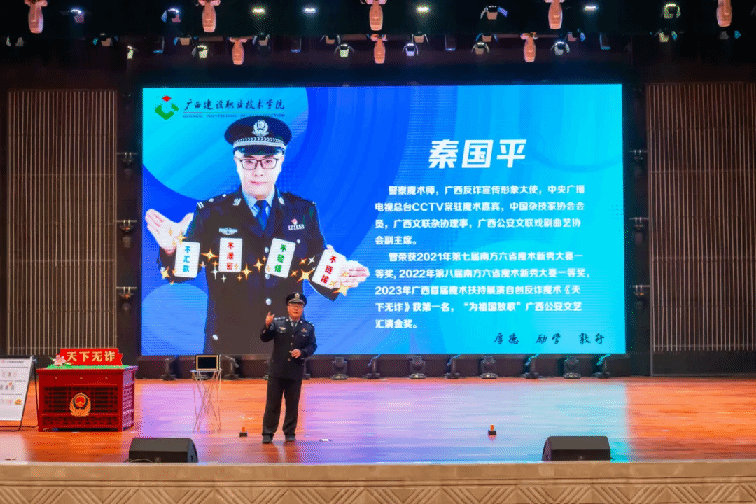 广西反诈宣传形象大使、著名警察魔术师秦国平警官为同学们带来了充满惊喜与创意的反诈魔术表演。