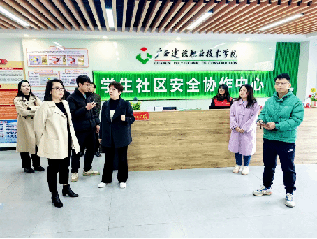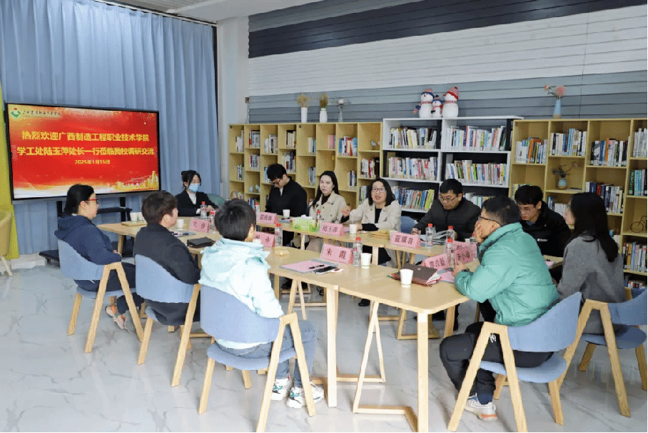 1月15日上午,广西制造工程职业技术学院学生工作处处长陆玉萍一行8人来到伟德国际官网,围绕“一站式”学生社区综合管理模式建设、辅导员工作室建设、学生管理工作等方面开展调研交流,伟德国际官网学生工作处处长周舟陪同调研。