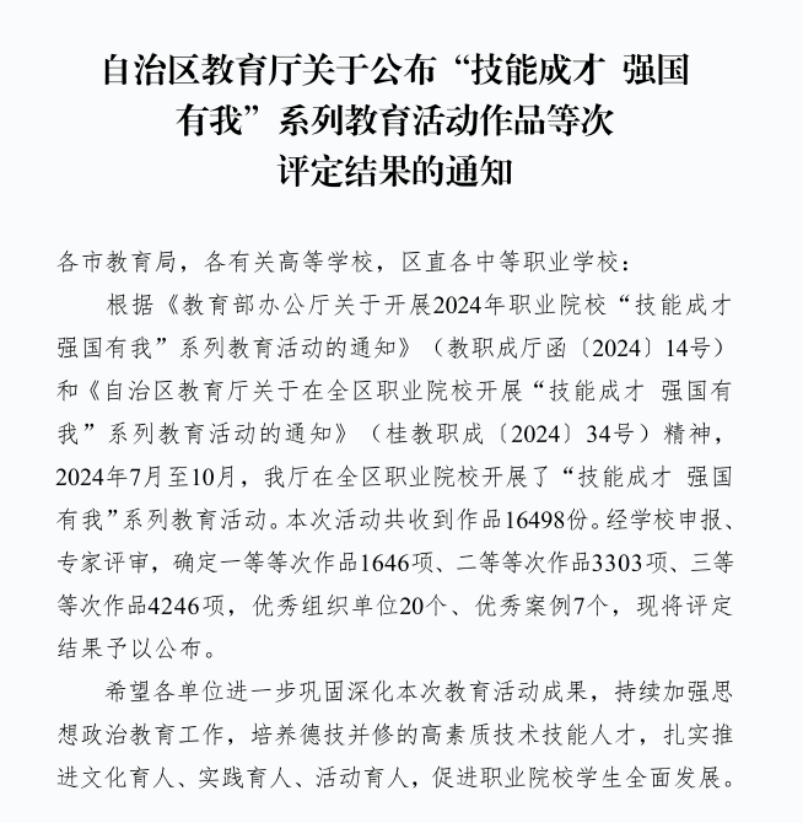近日,自治区教育厅公布2024年职业院校“技能成才 强国有我”系列教育活动评选结果,伟德国际官网选送作品获72项奖项,其中,一等奖22项、二等奖22项、三等奖26项,典型案例一等奖、三等奖各1项,获奖案例同时入选全区7项优秀案例之一,成绩喜人。