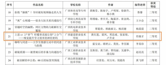 本次比赛,伟德国际官网黄红莲等学生团队完成的心理健康教育微课《上进 or 上“香”? 柠檬香直接让你“上分”!——嗅觉提升学习效率的神经密码》荣获学生组二等奖。同时,由徐海霞等学生组成的二支参赛队荣获全区大学生朋辈心理辅导技能大赛团体三等奖2项。