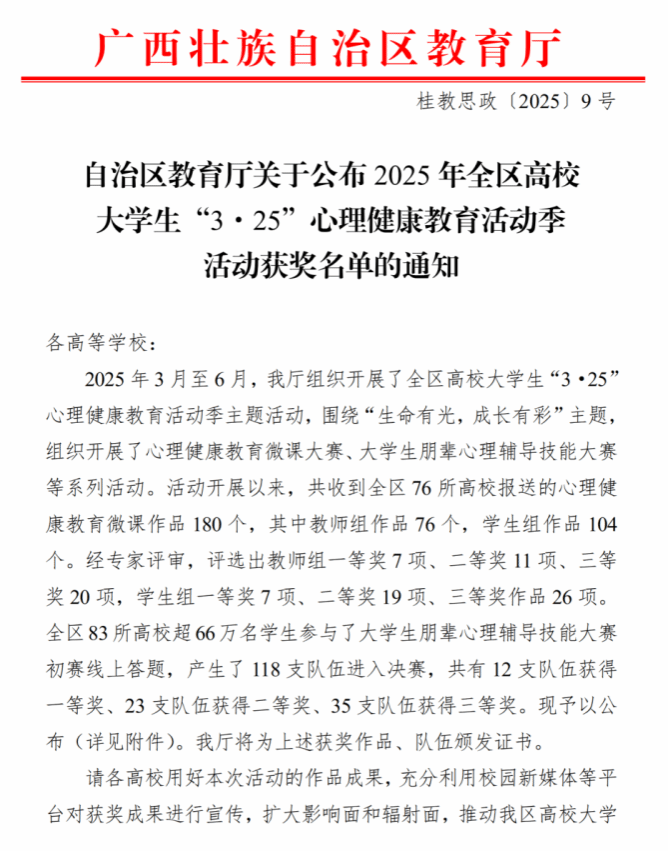 近日,自治区教育厅公布2025年全区高校大学生“3·25”心理健康教育活动季活动获奖名单。伟德国际官网代表队表现优异,获2025年全区高校心理健康教育微课大赛二等奖1项,获2025年全区高校大学生朋辈心理辅导技能大赛三等奖2项。