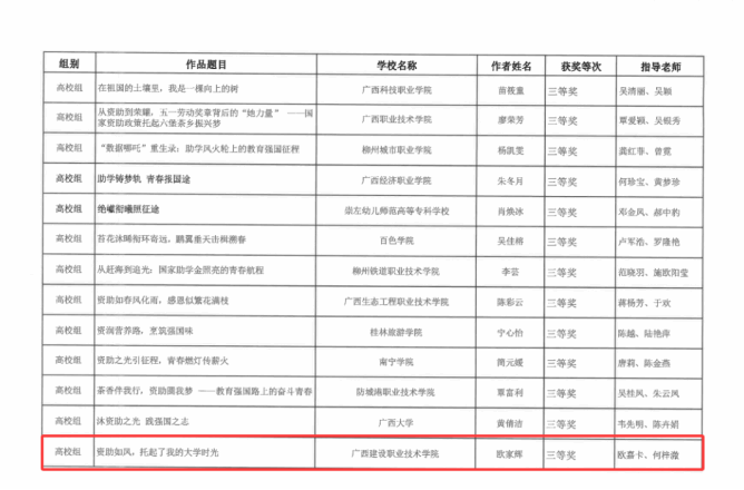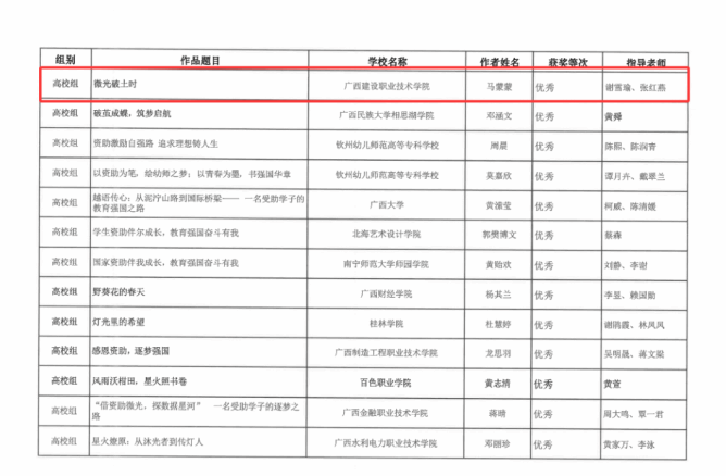 近日,自治区教育厅公布2025年全区“学生资助伴你成长,教育强国奋斗有我”资助主题征文比赛获奖名单,伟德国际官网土木工程学院建工2305班欧家辉的作品《资助如风,托起了我的大学时光》(指导老师:欧嘉卡、何梓溦)荣获高校组三等奖,土木工程学院建工2403班马蒙蒙的作品《微光破土时》(指导老师:谢雪瑜、张红燕)荣获高校组优秀奖!