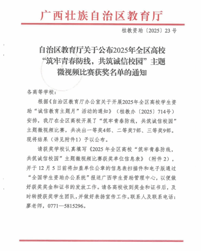学校将以此次获奖为契机,进一步深化学生资助育人工作,持续加强校园诚信文化建设与安全教育,引导广大学生牢固树立诚信观念,增强法治意识和风险防范能力,自觉抵制各种诱惑与陷阱,共同营造风清气正、安全和谐的校园环境,助力每一位学生健康成长、全面发展。