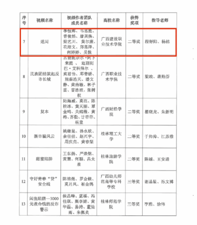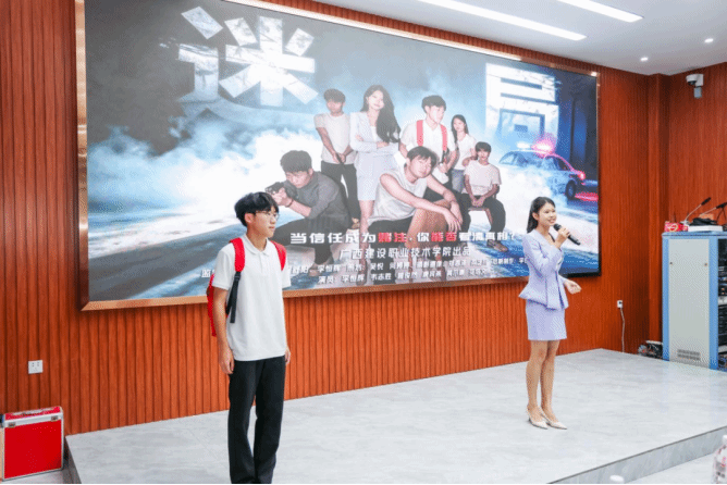 该作品由程舒阳、杨栋老师指导,李恒辉、韦志胜、曾俊然、唐宾燕、梁艺川、黄尔康、花培文、郑恩泽、何婷婷、吴悦同学共同创作完成。作品紧扣“筑牢青春防线,共筑诚信校园”主题,以大学生林墨的遭遇为主线,通过“街头试探”“三次交锋”“信任深渊”“黎明解救”四个层层递进的篇章,艺术化地呈现了诈骗陷阱的隐蔽性与复杂性,深刻揭示了在利益诱惑面前保持清醒、坚守诚信、筑牢思想防线的重要性。影片叙事流畅,悬念迭起,表演真挚,制作精良,生动诠释了新时代青年应有的警惕意识、辨别能力和价值坚守,最终从全区众多参赛作品中脱颖而出,获得佳绩。