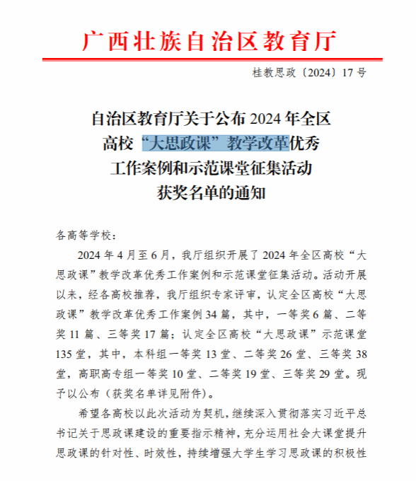 伟德国际1946源于英国9月6日讯(马克思主义学院 宋佳雄)近日,自治区教育厅公布了2024年全区高校“大思政课”教学改革优秀工作案例和示范课堂征集活动获奖名单。伟德国际官网马克思主义学院教师梁惠、莫玉婵的作品《数字化赋能“大思政课”实践教学范式的创新与实践》荣获“优秀工作案例”一等奖,毛娟翠、张博闻、毕莉的作品《传承八桂乡情,构筑中华民族共有精神家园》荣获高职高专组“示范课堂”二等奖,黄哲、梁晓祺、梁惠的作品《中国式现代化视域下壮美广西的甜蜜事业》...