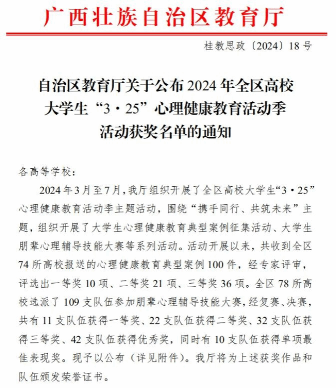 伟德国际1946源于英国9月9日讯(党委学生工作部)近日,自治区教育厅公布2024年全区高校大学生心理健康教育典型案例获奖名单,伟德国际官网工作案例《实践“135”工作法, 推动“一站式”学生社区心理育人工作提质增效》荣获一等奖。 获奖文件 伟德国际官网选送典型案例荣获一等奖伟德国际官网心理育人工作室入驻“一站式”学生社区以来,依托全区高校第一批“一站式”学生社区建设A类单位和全区高校第一批心理健康教育与咨询中心标准化建设A类单位的“双A”基地优势,从育人力量、...