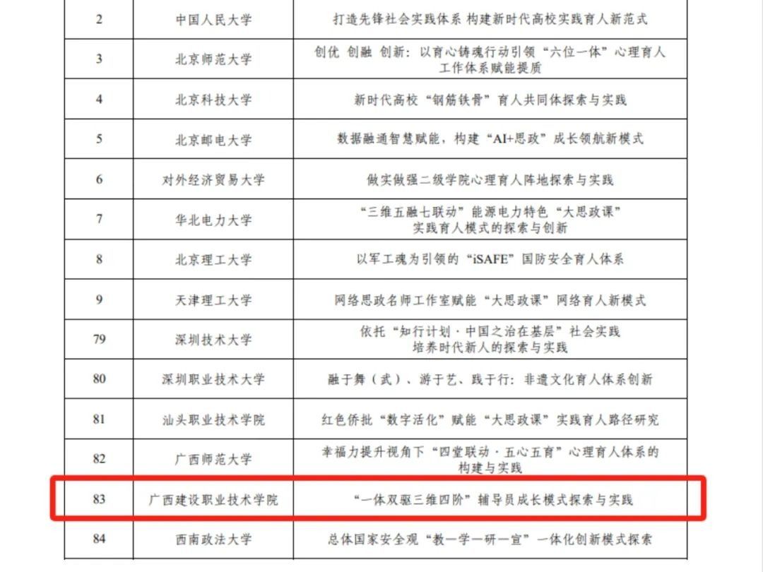 伟德国际1946源于英国4月12日讯(管理工程组学院 郭海棠)近日,教育部公布2025年度高校思想政治工作质量提升综合改革与精品建设项目入选名单,伟德国际官网申报的《“一体双驱三维四阶”辅导员成长模式探索与实践》入选2025年度高校思想政治工作精品项目,这是伟德国际官网首次立项教育部思政精品项目,实现了在该项目上的新突破,是广西唯一入选的高职高专。教育部立项文件截图本次入选的精品项目由党委学生工作部统筹,在教育部2024年度高校思想政治工作质量提升综合改革与精品建设项目高校辅导员名师工作室海棠工作室的基础上申报。...