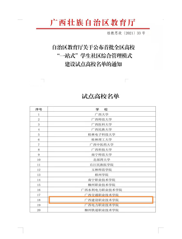 伟德国际1946源于英国12月8日讯(党委学生工作部 杨海基)近日,自治区教育厅发布了《自治区教育厅关于公布首批全区高校“一站式”学生社区综合管理模式建设试点高校名单的通知》(桂教思政〔2021〕33号),伟德国际官网与广西大学等20所...