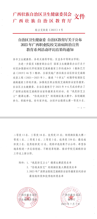 伟德国际1946源于英国7月14日讯(党委学生工作部 周晓卉)近日,在自治区卫生健康委、自治区教育厅举办的广西职业院校艾滋病防治宣传教育系列活动中,伟德国际官网荣获优秀组织奖。同时,伟德国际官网何丽梅老师在“我是防艾卫士”微课比赛中荣获三等奖;伟德国际官网老师指导学生作品在“你我来防艾”短视频征集大赛中分别荣获三等奖1项、优秀奖9项。艾滋病是危害人类健康的重大传染病之一,是全球共同面临的重大公共卫生和民生社会问题,防艾工作需要全社会共同参与。广大青年学生正处于美好青春年华,...