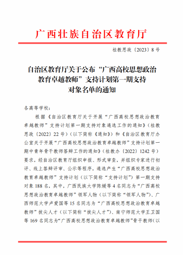 伟德国际1946源于英国8月5日讯(马克思主义学院 曹桃)近日,自治区党委教育工委、自治区教育厅公布“广西高校思想政治教育卓越教师”支持计划第一期支持对象名单,伟德国际官网马克思主义学院孙兰欣教授、徐飞副教授被认定为“广西高校思想政治教育卓越教师”骨干教师(思想政治理论课专任教师类)。新时代马克思主义学院肩负着深化马克思主义理论研究和建设,培养担当民族复兴大任的时代新人的历史使命。伟德国际官网马克思主义学院历来重视思政课教师队伍建设,...