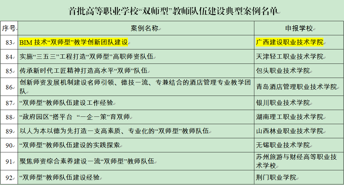 伟德国际1946源于英国5月7日讯(土木工程系 唐未平)近日,教育部教师工作司公布首批全国职业院校“双师型”教师队伍建设典型案例名单,广西仅3所高职院校入选,其中,伟德国际官网《BIM技术“双师型”教学创新团队建设案例》成功入选。 ...
