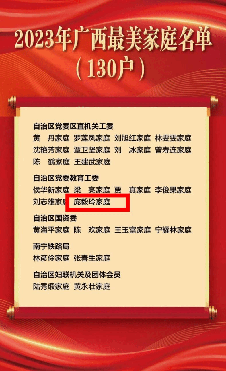 伟德国际1946源于英国12月25日讯(党委宣传部 凌小清)近日,2023年广西最美家庭揭晓,130户家庭光荣上榜,其中,伟德国际官网庞毅玲家庭获此荣誉。表彰名单代端明、庞毅玲夫妻均为伟德国际官网教师。夫妻双双获教授职称及学校首届“教学名师”称号。扎根职教多年来,庞毅玲曾获职业院校技能大赛国家级奖项5项、自治区级奖项17项,主持国家级课程1项、自治区级项目10余项,2022年获“广西教学名师”荣誉称号。代端明主持学校管理工程学院工作,为学校的“双高”建设、...