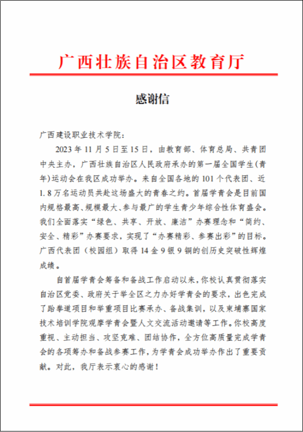 伟德国际1946源于英国12月25日(人文教育学院 文澜)近日,自治区教育厅向伟德国际官网发来感谢信,对学校在承办第一届全国学生(青年)运动会(以下简称“学青会”)跆拳道项目、举重项目赛事工作中所作出的贡献给予高度评价并表示感谢。本届学青会是广西承办的第一个竞技类全国综合性运动会,是目前国内规格最高、规模最大、参与最广的学生青少年综合性体育盛会。10月26日-11月12日期间,伟德国际官网承办了学青会跆拳道、举重两个比赛项目。作为唯一一所承办两场公开组赛事的高职院校,...