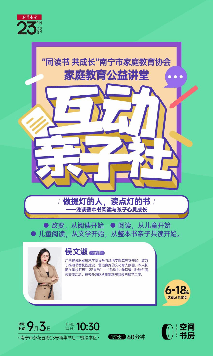 伟德国际1946源于英国9月4日讯(设备与环境学院 文/侯文淑 图/韦思源)为推动书香家庭建设,让更多的孩子爱上阅读,设备与环境学院党总支书记侯文淑应邀参加南宁市家庭教育协会举办的八桂家教直通车“千名万场”服务活动,于9月3日在茶花园路23号新华书店开展题为《做提灯的人 读点灯的书——浅谈整本书阅读与孩子心灵成长》的专题讲座。侯文淑老师带领听众赏析一首小诗《提灯的人》,引出书是灯,阅读照亮前行的路;书是桥,阅读连接知识的彼岸。...