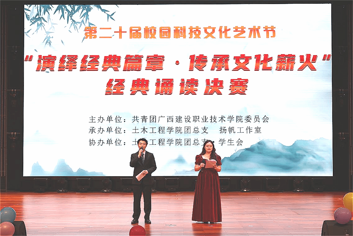 为弘扬中华优秀传统文化,打造校园原创文化品牌,近日,由校团委主办,土木工程学院团总支和扬帆工作室联合承办的第二十届校园科技文化艺术节经典诵读比赛决赛在学校礼堂举行。党委学生工作部、土木工程学院领导老师出席活动,2024级全体学生参加此次比赛。决赛现场 节目表演《土木八桂边疆情》《土木学子规》经典诵读比赛作为学校“一院一品”品牌,以传统经典《弟子规》为蓝本,融入土木学科专业特色与新时期思政教育内涵,分为 “...