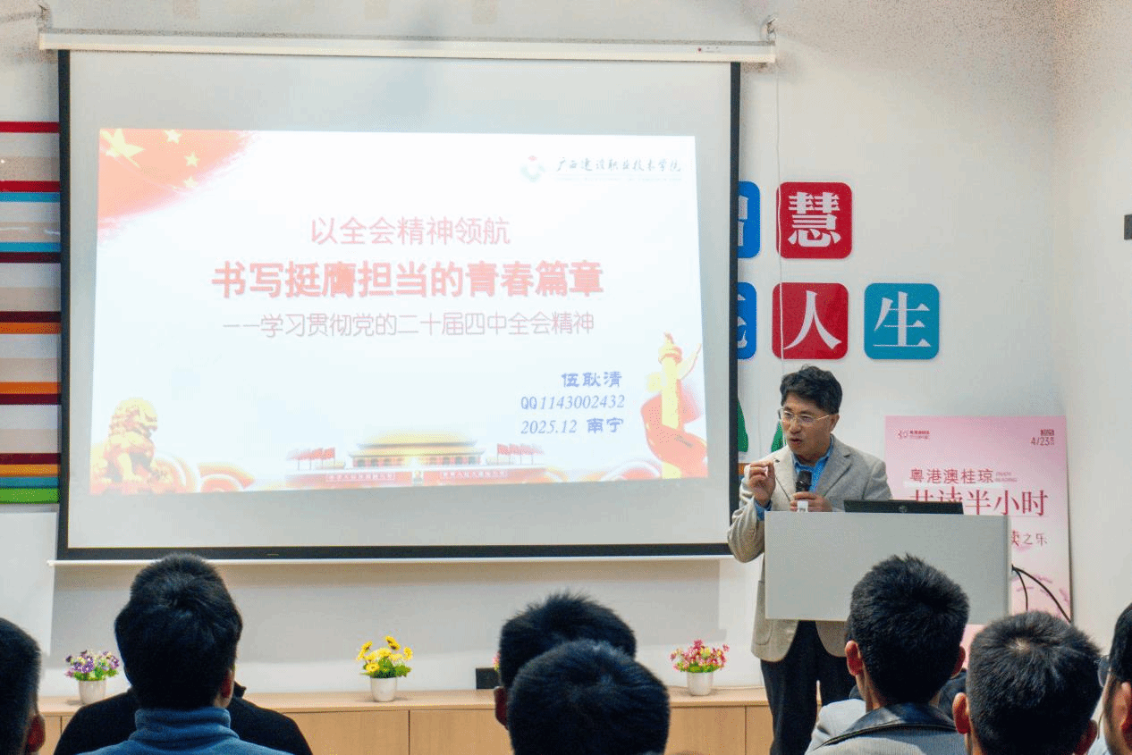 为深入学习贯彻党的二十届四中全会精神,引导广大青年学子筑牢思想根基、勇担时代使命,近日,艺术设计学院特邀广西学校国防教育学会副会长、伟德国际官网原副校长伍耿清,走进伟德国际官网“一站式”学生社区书苑,开展专题理论辅导。艺术设计学院师生代表共同参加学习。授课现场师生认真聆听伍耿清教授以“以全会精神领航,书写挺膺担当的青春篇章”为主题,紧扣党的二十届四中全会精神的核心要义,结合新时代青年的历史使命与成长实际,从理论逻辑、...