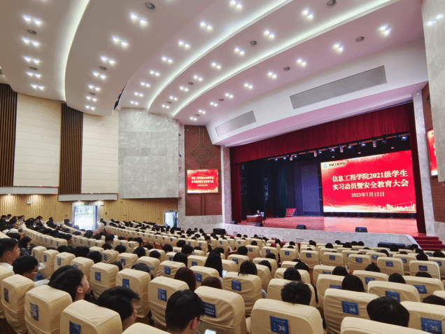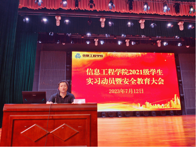 (文/韦杏霖 图/罗凤媚)为强化同学们的职业素质训练,增强岗位意识和岗位责任感,提高综合素养,信息工程学院于2023年7月12日在学校礼堂召开2021级学生实习动员暨安全教育大会。信息工程学院学院领导、毕业班实习指导老师、带班辅导员及全体2021级学生参加了此次大会。