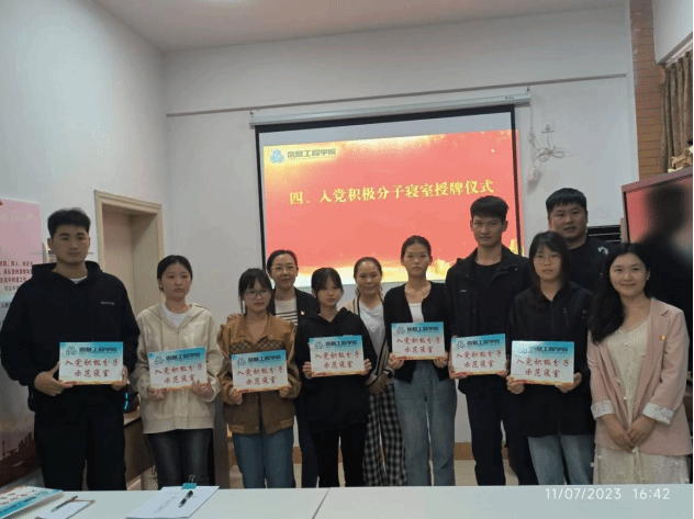 (图文/黄映燕)为促进宿舍文明建设,营造“讲政治、讲文明、讲学习、讲卫生”的寝室氛围,发挥入党积极分子在日常学习生活中的模范带头作用,11月7日下午,信息工程学院在学生公寓党建工作室开展了“亮身份 做表率 树形象”入党积极分子示范寝室挂牌活动。