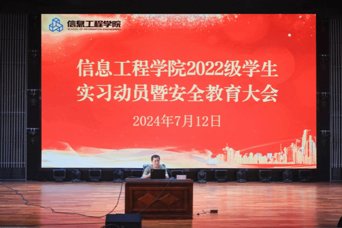 (信息工程学院 文/何鑫 图/黄尧)为进一步做好学生实习工作,引导学生明确实习目标,增强安全意识、岗位意识和岗位责任感,信息工程学院于2024年7月12日在学校礼堂召开2022级学生实习动员暨安全教育大会。信息工程学院学院领导、毕业班实习指导老师、带班辅导员及全体2022级学生参加了此次大会。