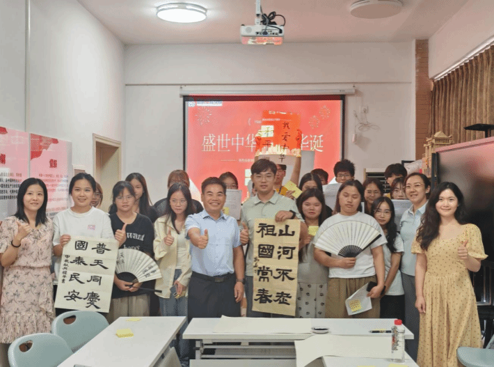 现场气氛热烈、激情高涨。活动中,大家观看视频《大国崛起》,精彩内容引领同学们牢记时代责任,坚定跟党走、建功新时代;同学们齐声朗诵《沁园春·雪》,以诗为载体,用声音传递爱国情怀;通过书写红色寄语和爱国诗词,大家表达着对祖国的爱,送上对祖国母亲的美好祝福。