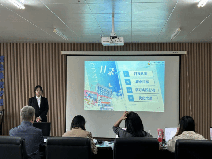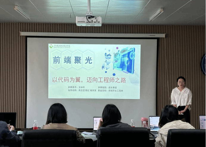 比赛现场,进入决赛环节的25名选手围绕“成长赛道”和“就业赛道”展开激烈角逐。选手们紧扣“自我认知—职业定位—行动计划—动态调整”的逻辑主线,运用PPT展示个人职业规划方案,展现了扎实的专业基础与清晰的发展思路。例如,其中一位参赛选手以《前端聚光:以代码为翼,迈向工程师之路》为主题,系统阐述了从编程初学者到立志成为前端开发工程师的成长路径;再如,另一位选手则将个人经历融入职业规划,分享了她在省级创新创业大赛中的实践成果,并以此为基础制定了“数据工程师”的长期发展目标,展现出良好的综合素养与实践能力。