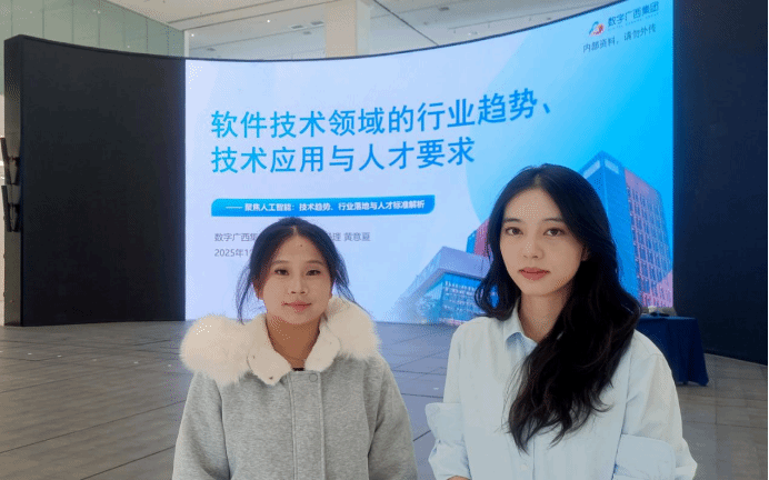 智桂通科技有限公司人事部韦肃经理对师生一行表示欢迎,带领大家参观了企业办公区、研发中心与产品展示厅,详细介绍了公司在数字广西建设中的核心业务与重要成果。数字广西集团研发中心产品经理黄意夏作《软件技术领域的行业趋势、技术应用与人才要求》专题分享,帮助学生进一步了解行业动态与职业发展路径。