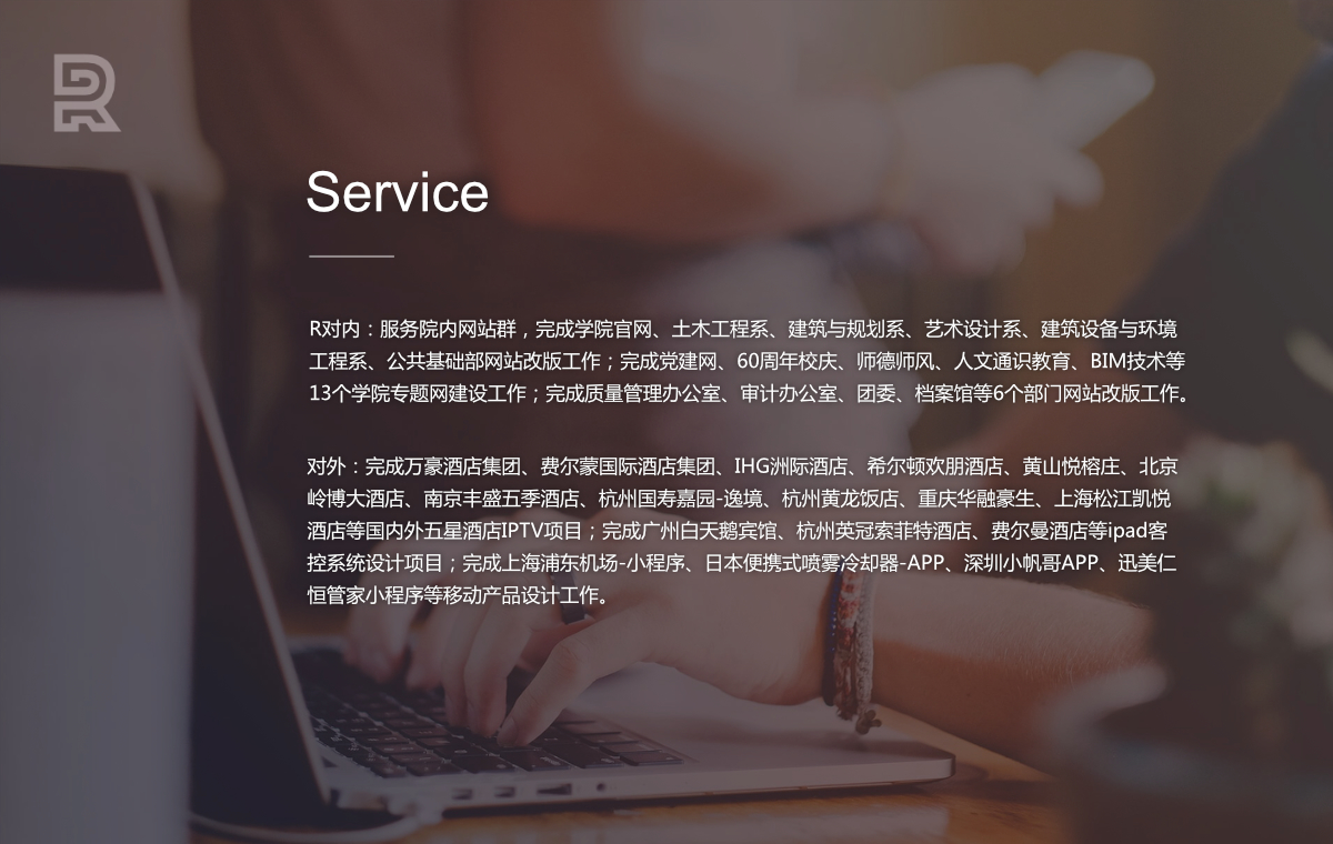 R设计工作室长期承接网站建设、UI设计、VI设计、移动产品设计开发等制作项目。工作室成员从每届数字媒体艺术设计专业班级中选拔熟练掌握HTML5+CSS3技术、PS、SKETCH、JS、AI、AE等软件的学生,在指导老师指导下,对内服务学院网站群建设,对外与上海圆动、广州安美数字、南宁金睿网络合力承担了国内外五星级酒店IPTV、移动互联产品(APP、微信小程序)的制作项目。作品列举如下: