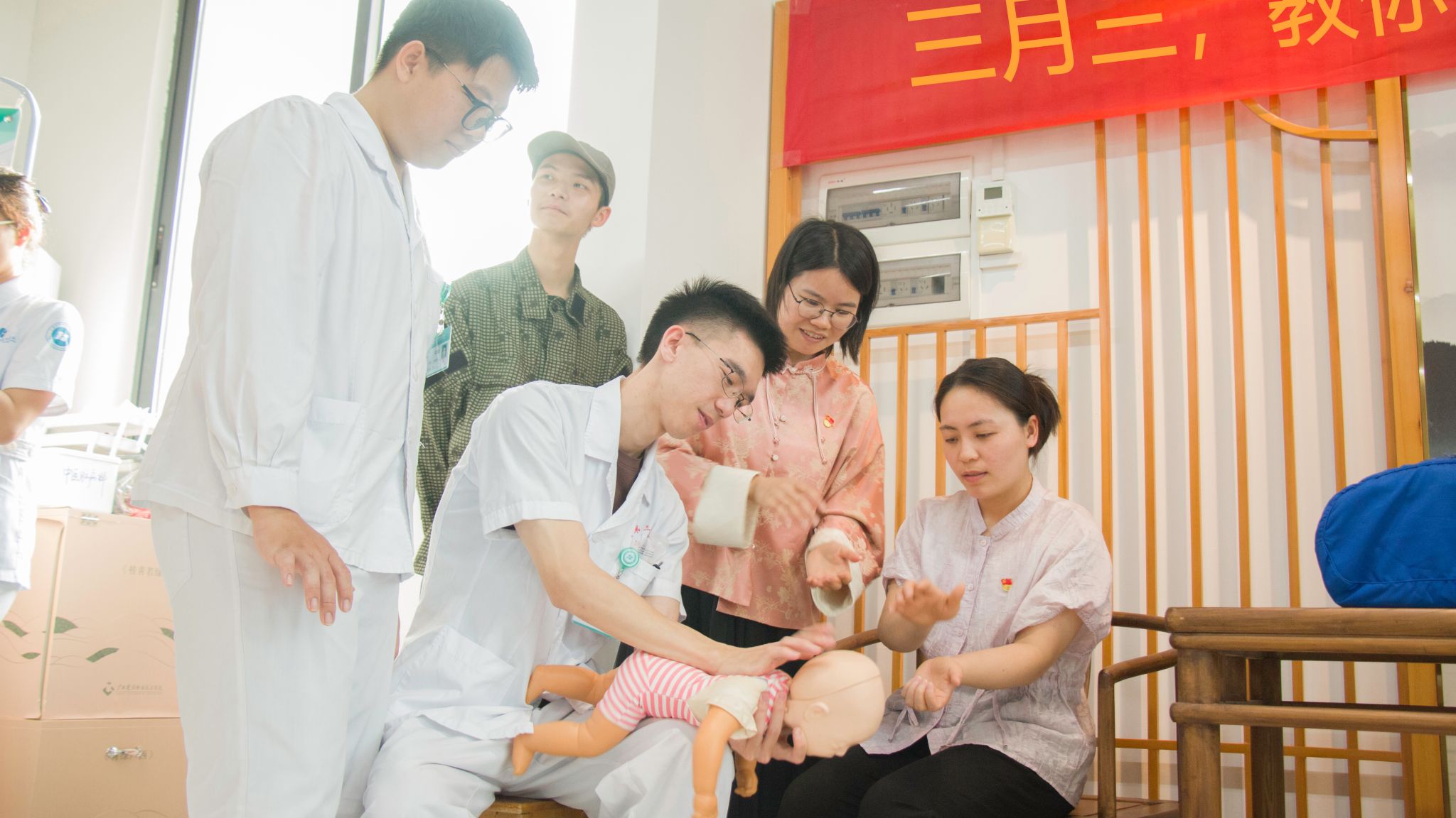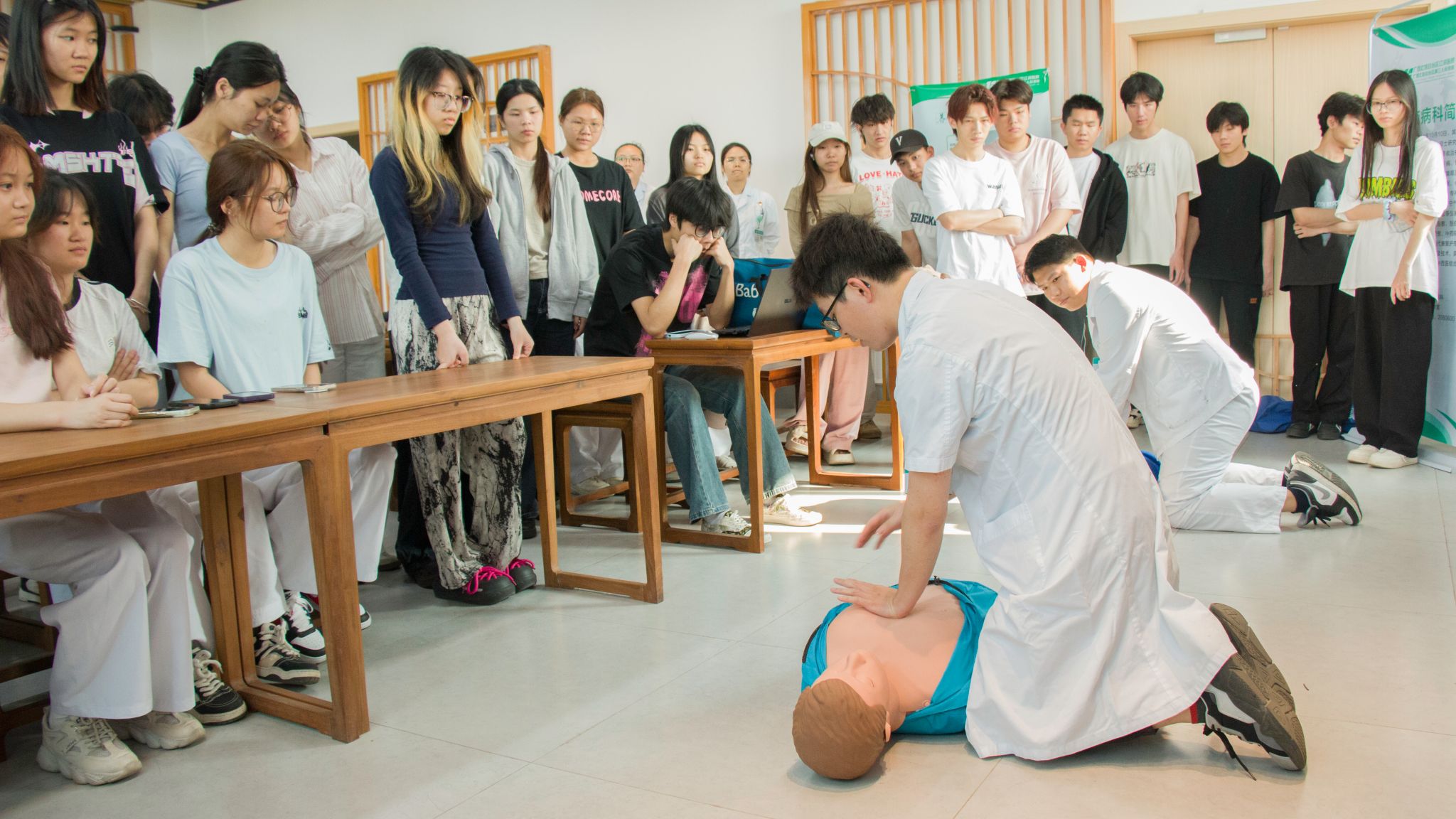 江滨医院中医脑病科医生给同学们实操演示肺复苏流程