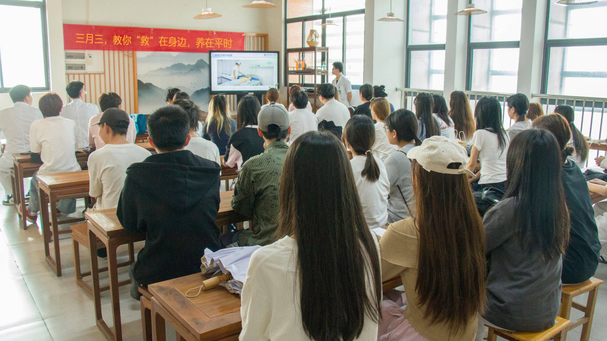 同学们在认真看心肺复苏实操视频