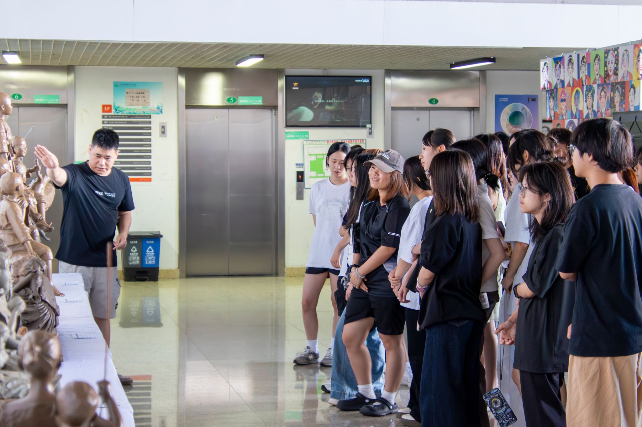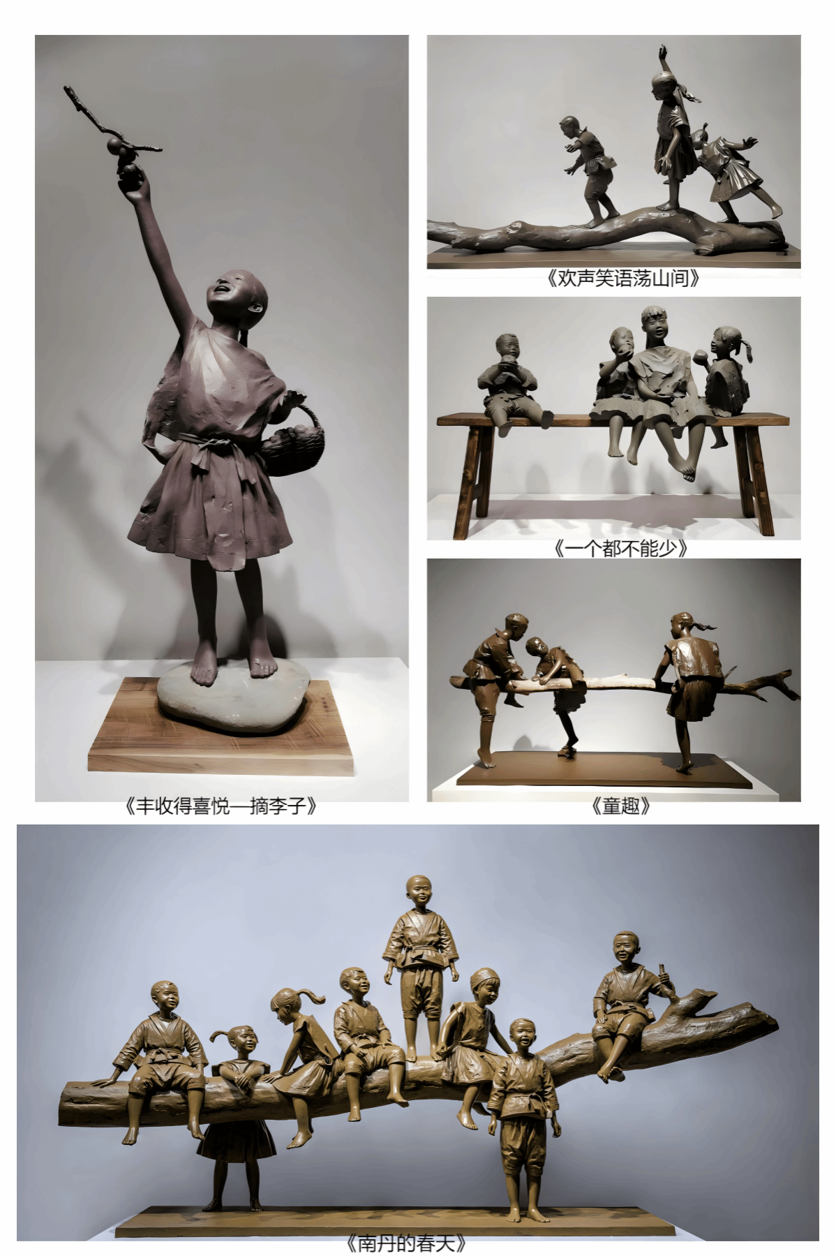 展览现场,伟德国际官网国家艺术基金入选者、高级工艺美术师覃石胜老师的《瑶童塑梦》系列雕塑成为焦点。该系列作品以广西南丹白裤瑶儿童为原型,通过虚实结合的艺术手法,塑造了瑶族少年儿童嬉戏玩耍的生动场景。其中,代表作《南丹的春天》以长达1.9米的体量,展现白裤瑶族儿童围绕一根树干开心玩耍的幸福瞬间,完美呈现了儿童自由自在、天真烂漫的状态,作品既保留民族文化原真性,又注入当代艺术的人文关怀。该系列曾获“百花杯”评审活动金奖,此次系首次在校园内进行全系列展出,为师生提供近距离观摩国家级创作的珍贵机会。