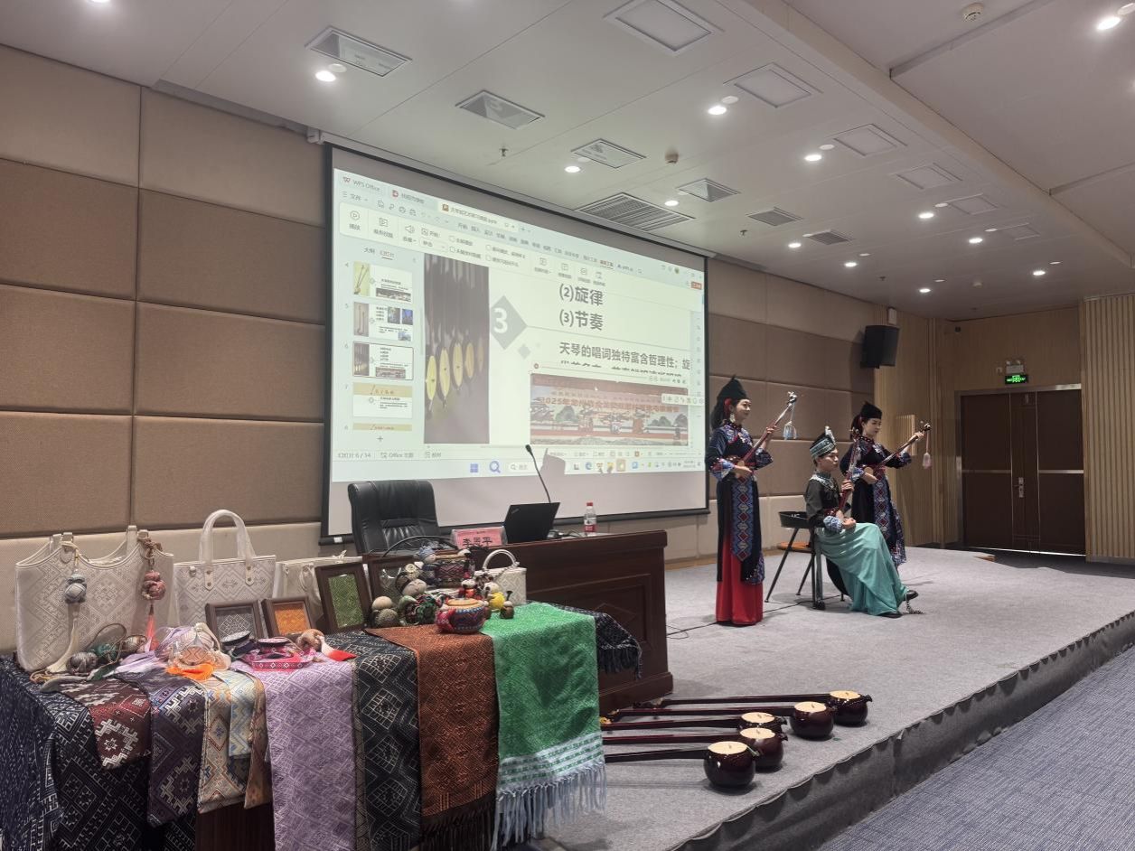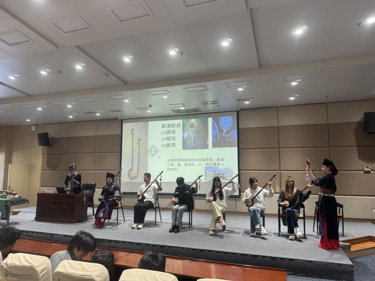 李恩平是壮族天琴艺术的重要传承人与创新实践者。其艺术实践始于2014年成立的“美女村天琴梦组合”,该组合曾以原创编舞《花山情·爱十八》参加CCTV非常6+1并获崇左赛区第四名。2017年元旦,李恩平正式创立天琴郎艺术工作室,致力于天琴艺术的系统传承与创新推广。 讲座中,李恩平从天琴的历史渊源讲起,系统地介绍了这一壮族古老乐器的发展历程。“天琴不仅是乐器,更是壮族文化的活化石,承载着我们民族的历史记忆和审美情感,”李恩平表示。他详细讲解了天琴的形制特点、制作工艺和演奏技巧,让师生对天琴有了全面认识。