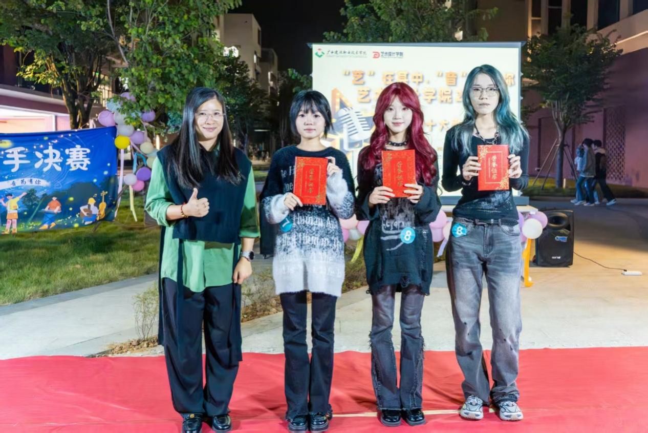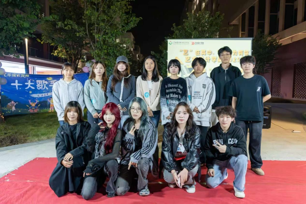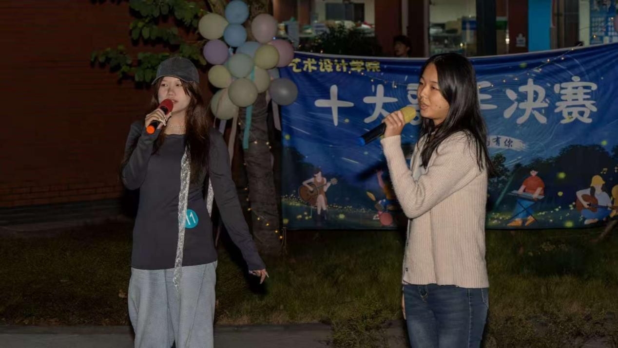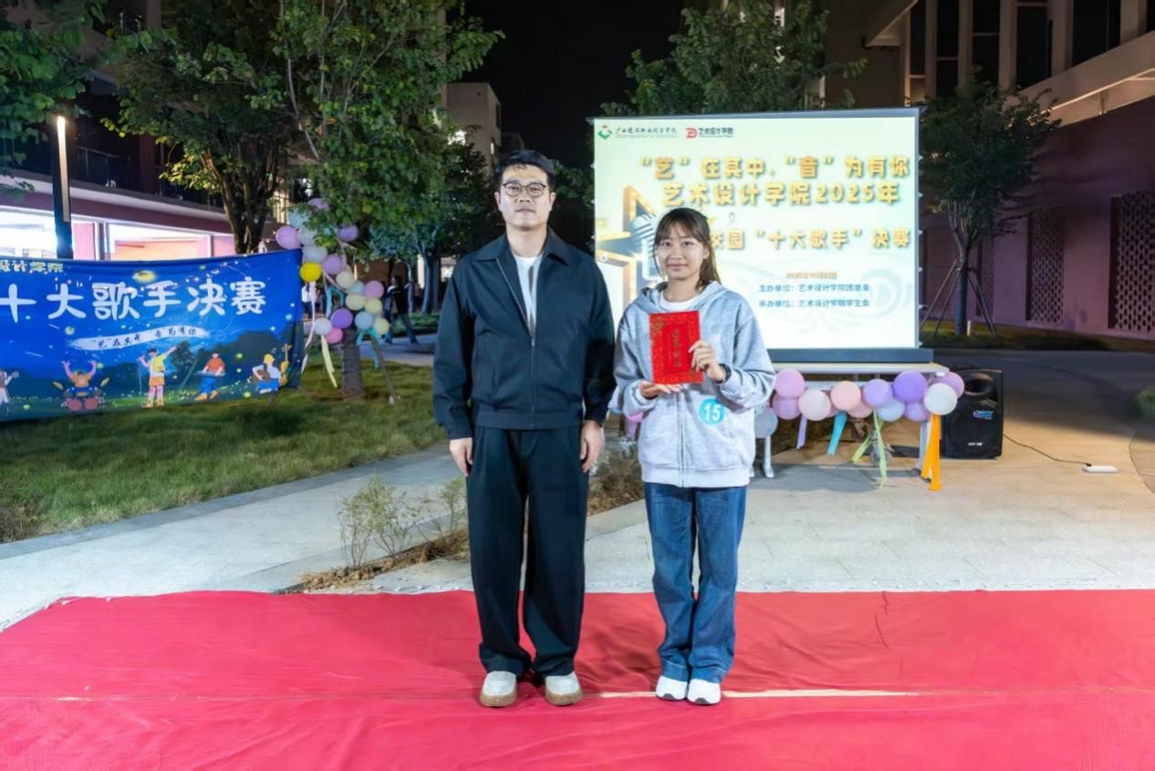 为丰富校园文化生活,营造积极向上、富有艺术气息的校园文化氛围,艺术设计学院于10月28日晚,在武鸣校区一号教学楼户外阶梯空地为同学们举办了一场以“‘艺’在其中 ‘音’为有你”为主题的校园“十大歌手”比赛。本次活动由艺术设计学院团总支主办,艺术设计学院学生会承办,本次比赛共有2024级、2025级60余名选手报名,经过海选共有15名选手晋级比赛,学院团总支书记与2025级辅导员出席活动并担任评委。