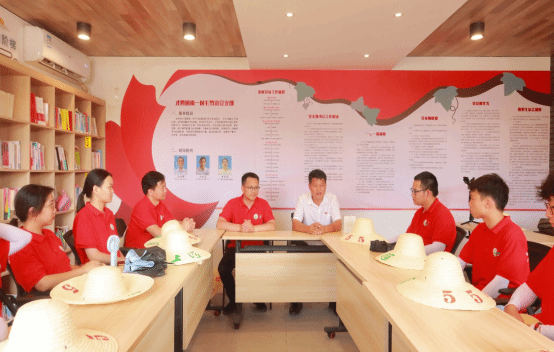 实践队首先来到全州县才湾镇南一村,这里是湘江战役的重要战场,湘江战役三大阻击战之一脚山铺阻击战就在这里发生,这里的村民几乎人人都能讲有关红军的英雄故事。实践队成员从村口徒步前往南一村,路上大家深刻感受到南一村在党的领导下乡村风貌焕然一新、特色产业蓬勃发展、村民生活蒸蒸日上的巨大改变。抵达南一村后,实践队受到南一村党支部书记王军荣亲切接待,并开展座谈交流。王书记为实践队介绍了南一村基本情况,特别提到了2021年4月25日,习近平总书记到才湾镇南一村下辖的毛竹山村考察推进乡村振兴、基层治理时,与村民王德利交谈中有这样一段对话: