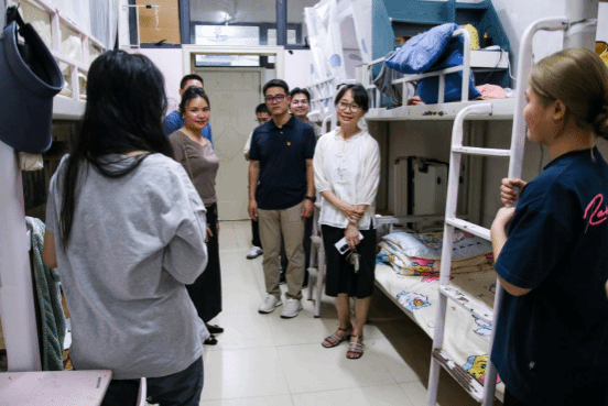 迎新结束当晚,学院领导、新生辅导员、班主任老师们一同深入学生宿舍,了解学生的入住及生活适应情况,为新生送去无微不至的关怀。老师们一间间地走访,询问学生适应新环境的情况,了解学生的生活需求,并鼓励同学们以积极向上的心态迎接新的学习、生活。一名新生说道:入校后看到优美的校园环境,感受到老师、学长、学姐们的热情关怀,很是亲切,也为后续在校的学习、生活增添了信心。