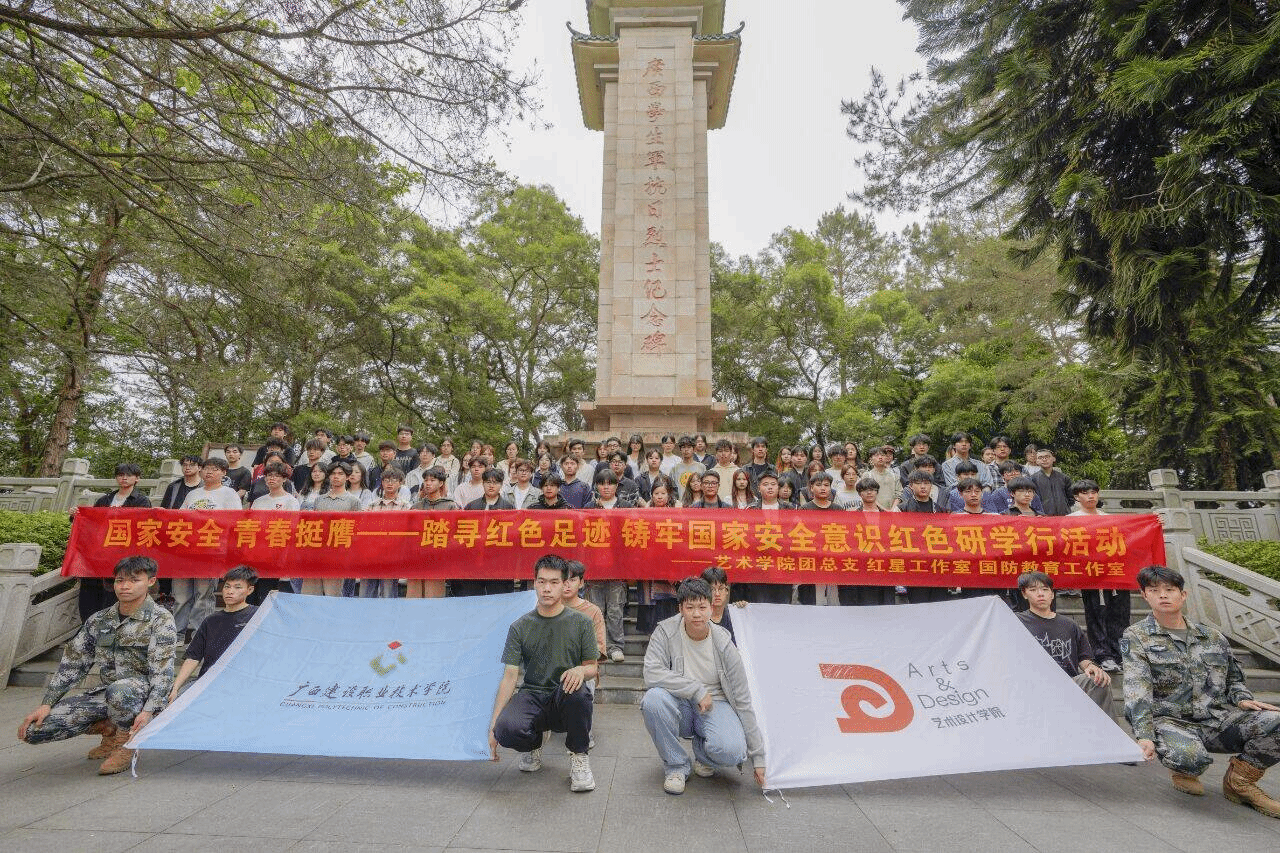 4月14日,艺术设计学院团总支带领百名优秀学生代表赴广西学生军抗日烈士纪念碑开展沉浸式国家安全教育。师生们通过瞻仰先烈、默哀致敬、重温入团誓词等仪式缅怀革命先烈,深刻感悟“天下兴亡,匹夫有责”的爱国主义精神。程舒阳老师在纪念碑下讲授了一堂生动的国家安全教育课,结合抗日学生军抛头颅、洒热血的英雄事迹,传承红色基因,深入阐释新时代青年在国防安全、网络安全、意识形态安全等领域的历史责任。
