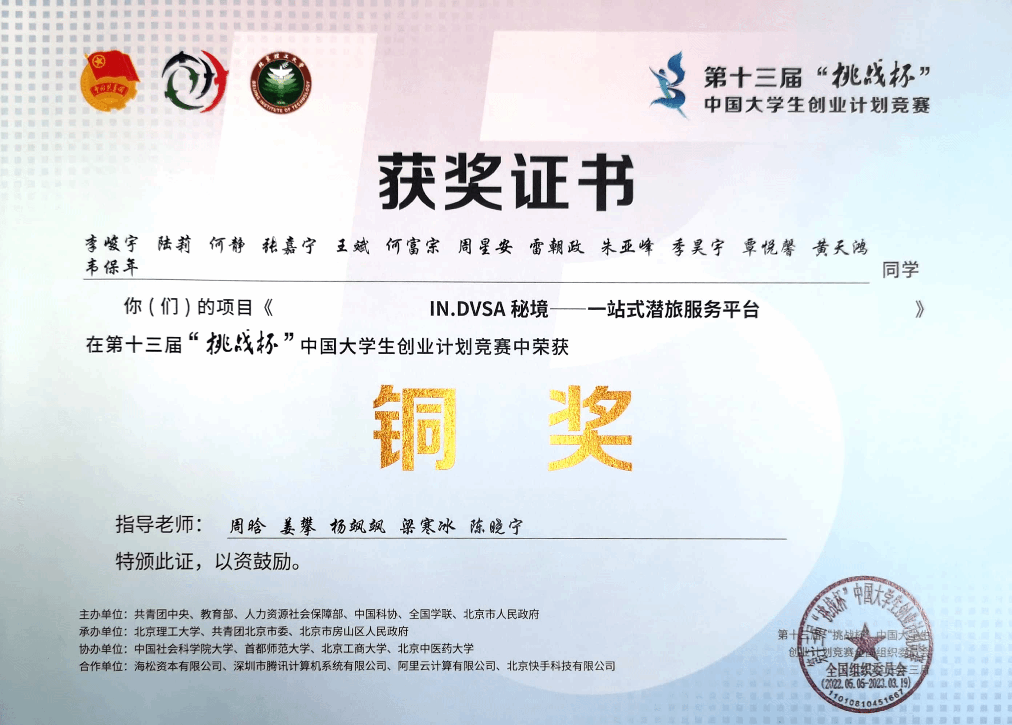 第十三届“挑战杯” 中国大学生创业计划竞赛全国铜奖