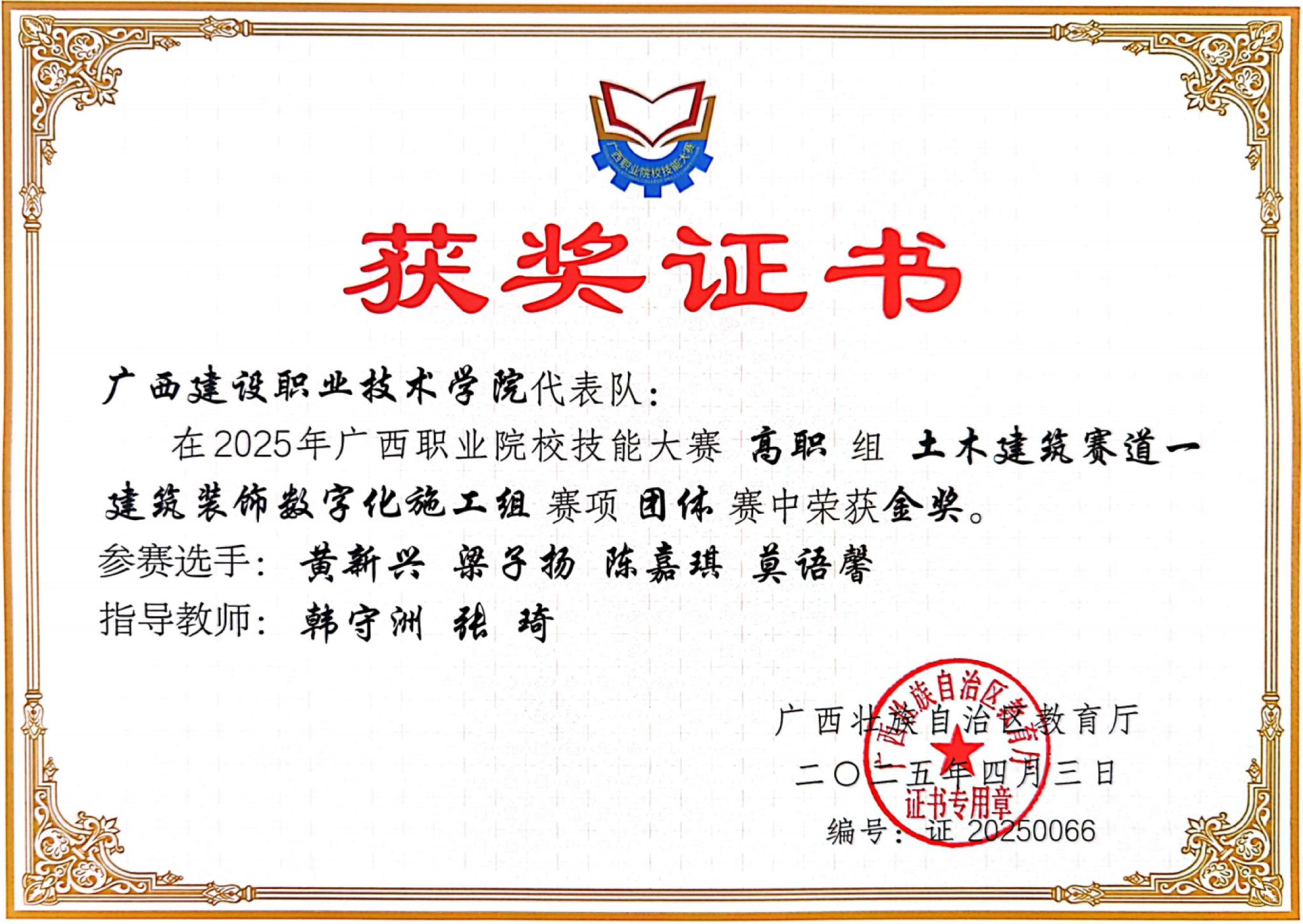 2025年广西职业院校技能大赛高职组土木建筑赛道一建筑装饰数字化施工组赛项团体赛金奖